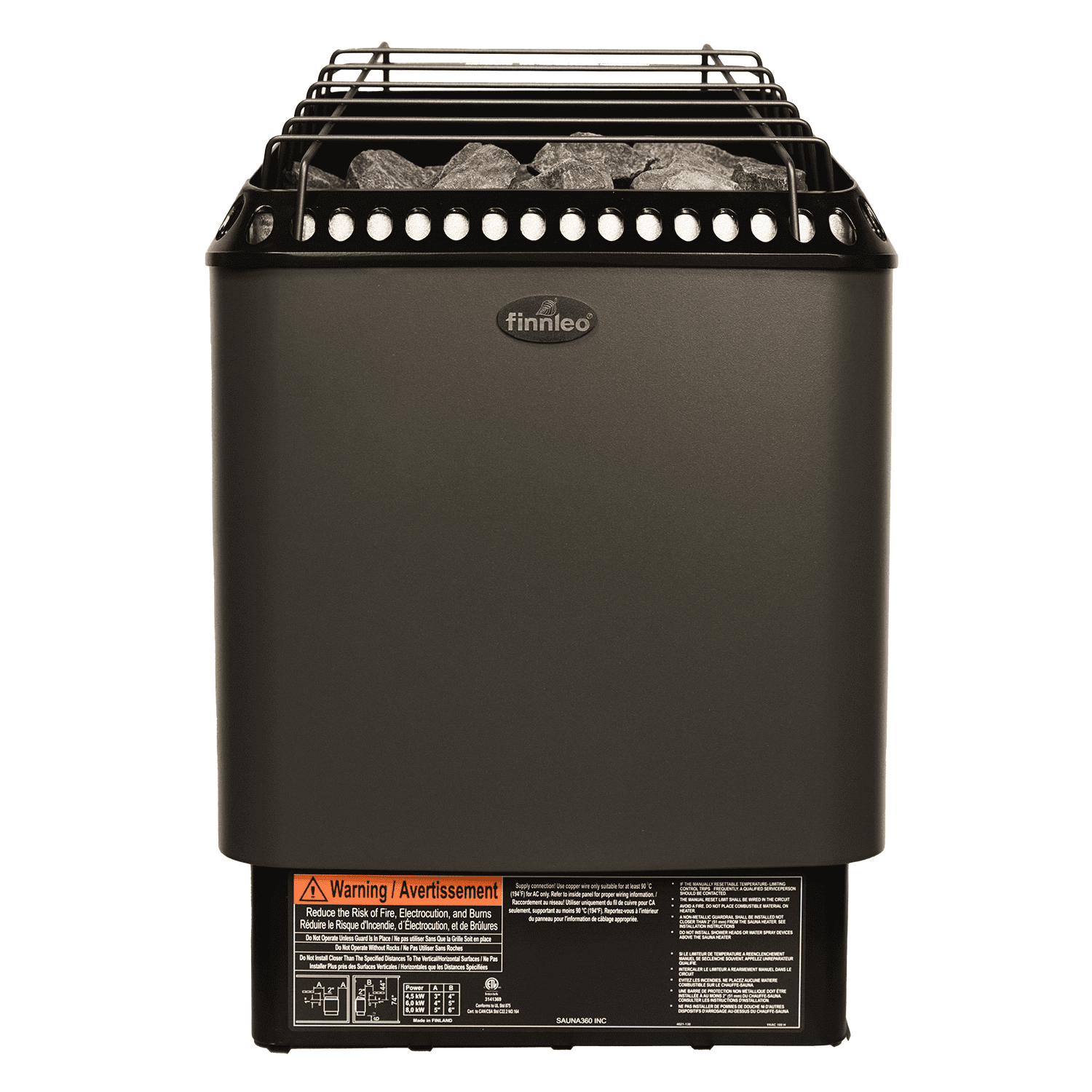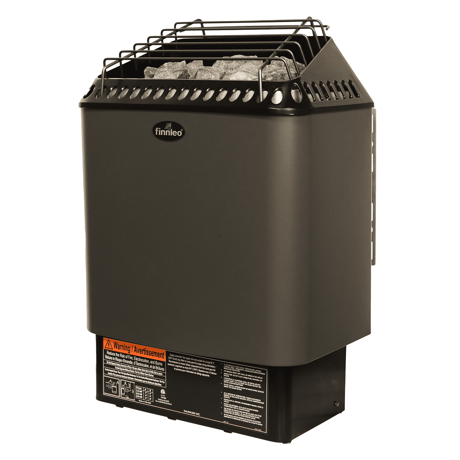 • Supports up to 50lbs of sauna rocks• 4.5KW, 6KW and 8KW available• 240 or 208 available• 16-1/2″ W x 11″ D x 23″ H